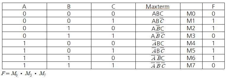 A maxterm is a sum term in which all inputs appear in its original for or in its complement form( F를 1로 만드는 것에 집중)